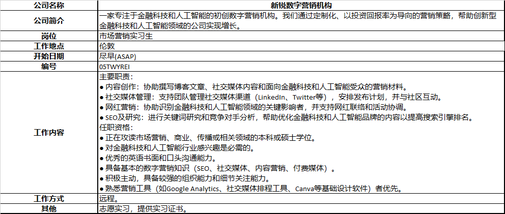 | S.X.X | 伦敦咨询公司 | Marketing intern | ![]() | Feed back | 市场 | 实习 |