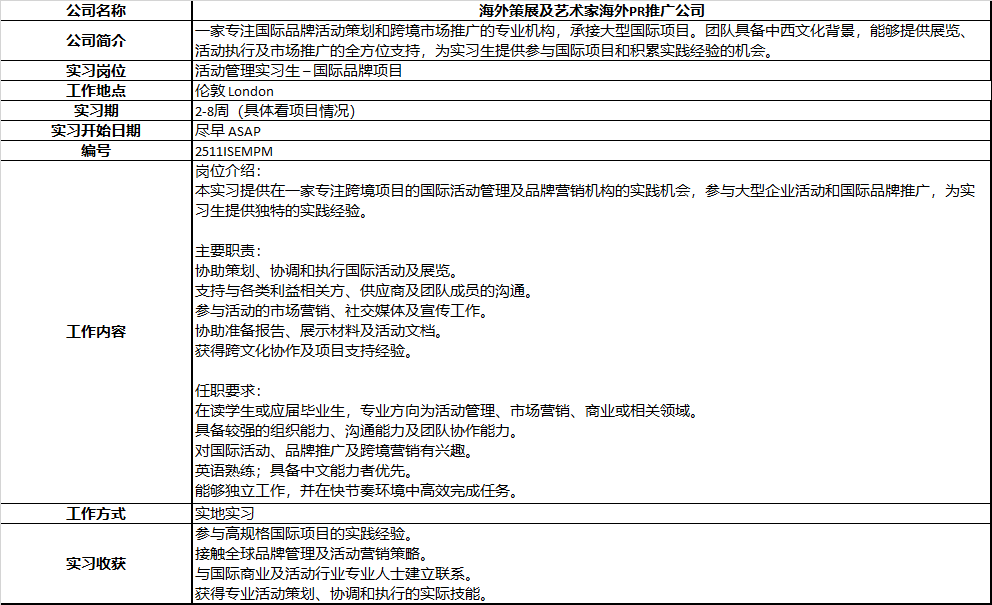 | Z.Y | 伦敦咨询公司 | Research Internship in the Events/Exhibitions Department | ![]() | Feed back | 市场 | 实习 |